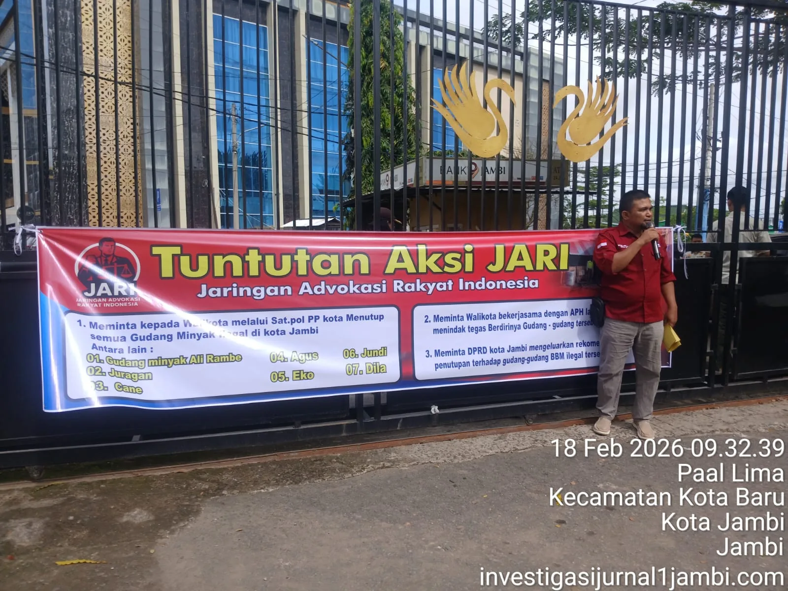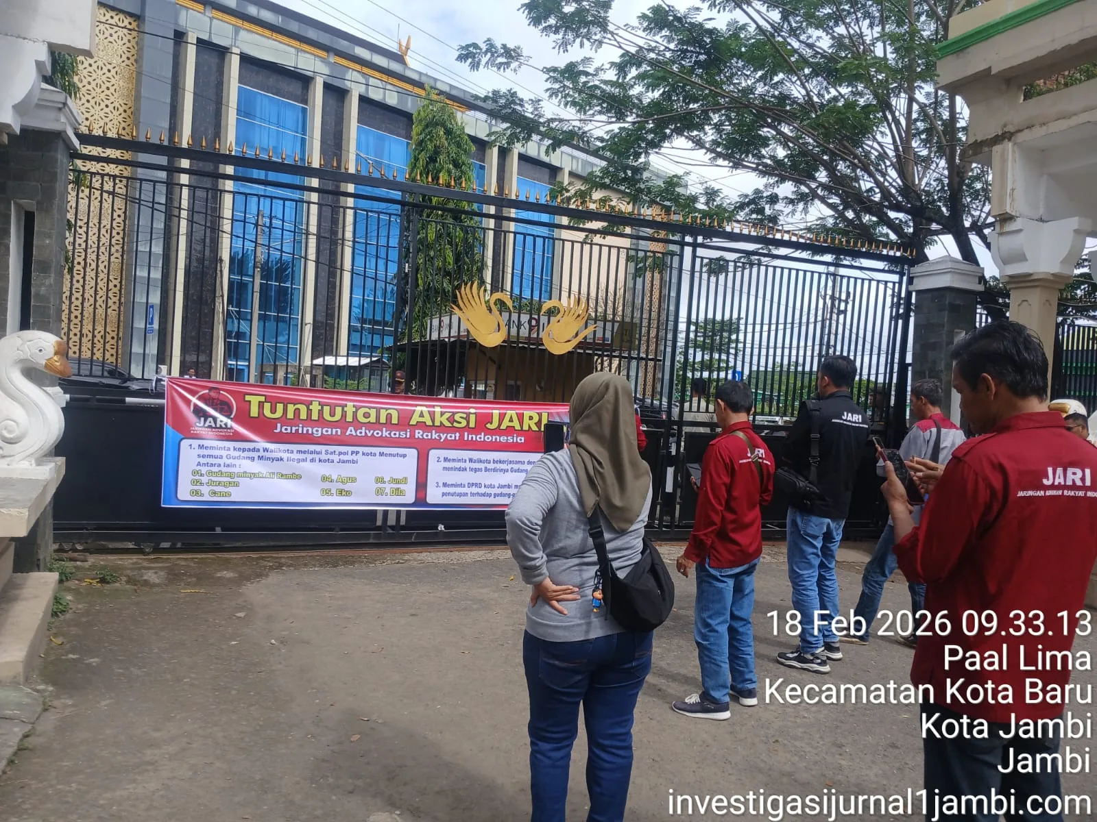 Faktatoday.com – Kota Jambi, 18 Februari 2026. Jaringan Advokasi Rakyat Indonesia (JARI) menggelar aksi damai menyoroti dugaan keberadaan sejumlah gudang bahan bakar minyak (BBM) ilegal di wilayah Kota Jambi. Aksi dimulai pukul 09.00 WIB dan berakhir dengan hearing di Kantor Satpol PP Kota Jambi.
