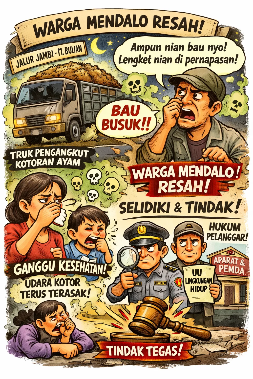 Faktatoday.com – Muaro Jambi – Aroma busuk yang menusuk dan “lengket” di pernapasan kembali meneror warga di sepanjang Jalan Lintas Jambi–Ma. Bulian, khususnya kawasan Mendalo. Bau menyengat yang diduga berasal dari muatan kotoran hewan (ayam) itu disebut-sebut kerap melintas pada malam hari, mulai pukul 22.00 WIB hingga dini hari.
